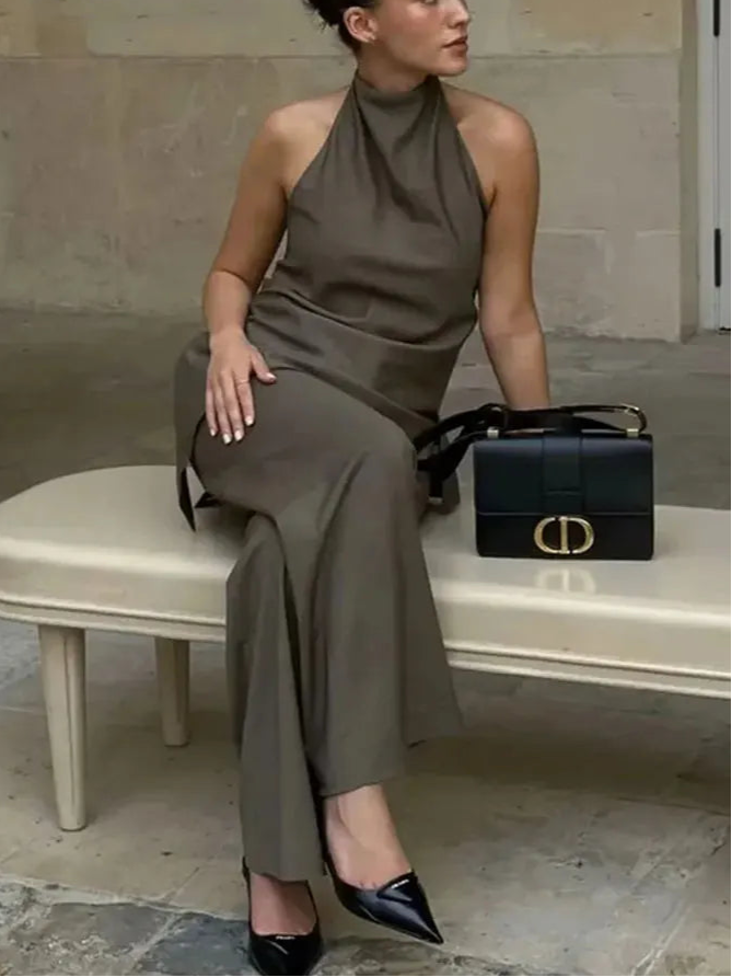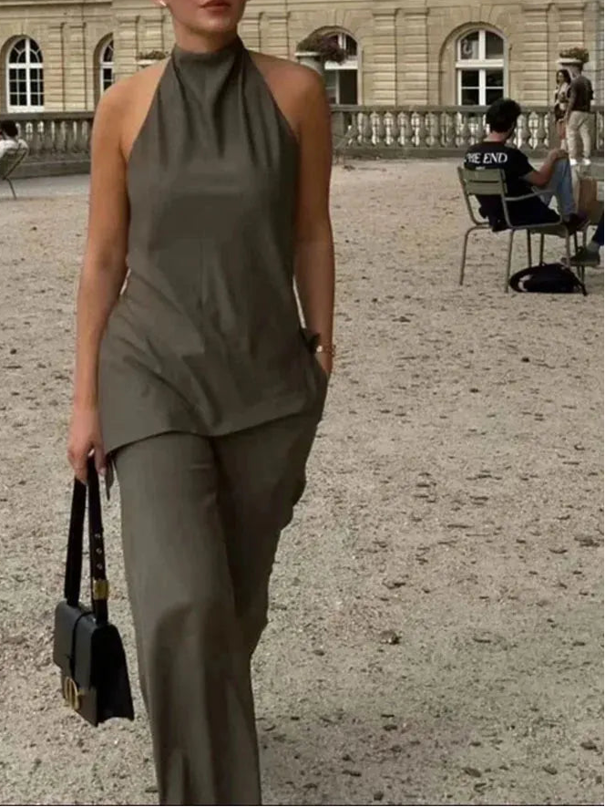 O Conjunto Jessy é o equilíbrio perfeito entre elegância minimalista e impacto visual. Com design moderno e recortes estratégicos, sua blusa de gola alta e costas totalmente abertas oferece um toque audacioso sem perder a classe. A modelagem fluida da calça pantalona alonga a silhueta e proporciona movimento leve e sofisticado.