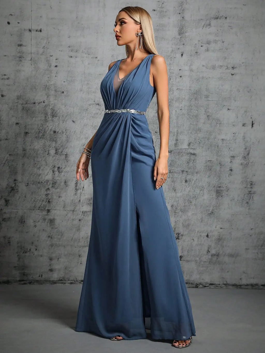 Com decote em V e detalhe em tule, o busto drapeado se une à cintura marcada com um cinto de pedraria delicado, criando uma composição glamourosa e atemporal. A fenda frontal discreta adiciona sensualidade sem abrir mão da elegância. Ideal para casamentos, formaturas, eventos de gala e festas memoráveis.