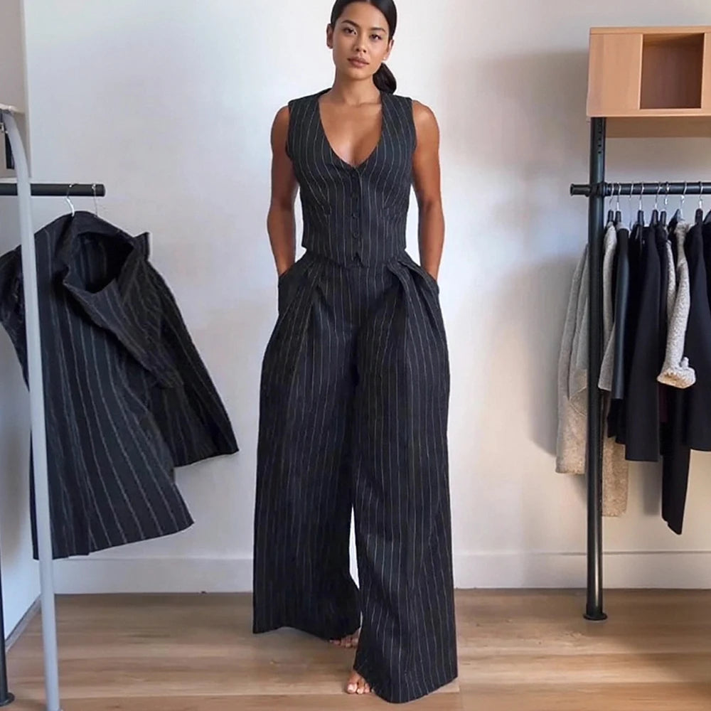 O colete com decote em V profundo traz feminilidade na medida certa, enquanto a calça pantalona garante movimento e imponência ao look. A combinação perfeita entre estilo clássico e atitude fashion.